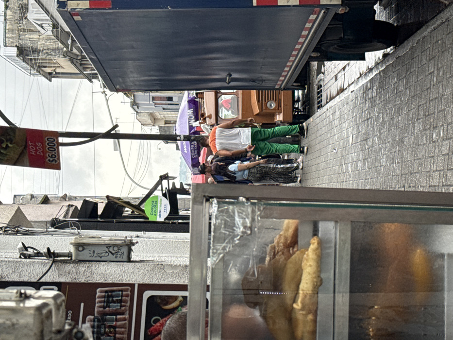 The image depicts an urban street scene in Perimetro Urbano Pereira, Colombia, under an overcast sky. In the immediate foreground on the left, a glass display case with a metal frame contains multiple golden-brown fried pastries, likely empanadas, arranged on shelves. The top shelf holds two pastries, and a third is partially visible on the bottom shelf. Further into the scene, a raised grey paved sidewalk extends towards the background. On the sidewalk, a group of four individuals is standing. One man, seen from the back, wears a white sleeveless shirt with an orange horizontal stripe across the upper back and bright green track pants with black athletic shoes. To his left, a woman, partially obscured, wears a light blue top and patterned grey pants. Behind them, another man wears a dark blue top and a dark baseball cap. Additional indistinct figures are visible further down the sidewalk near a purple umbrella marked "WOM." To the right of the sidewalk, a dark blue cargo truck is parked, its rear section prominently displayed. It features a red and white reflective strip along its lower edge. Behind this truck, a vintage-style, light brown or orange compact utility vehicle or small truck is visible on the street. Along the left side of the street, buildings with multiple stories and various architectural details are present. A light-colored building displays a "Compra a cuotas sistemacredito" (Buy in installments systemacredito) sign in green. Overhead, utility wires crisscross the sky, and a metal pole supports a red sign indicating "HOT DOG $6.000." The street surface appears wet in areas, possibly from rain or spillage.