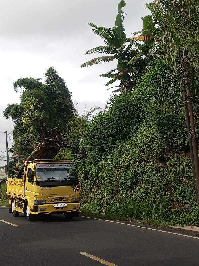 A yellow truck carries a load of bamboo on a road. The truck's license plate reads "F 9336 YU." Lush green vegetation covers the embankment beside the road, with tall banana trees visible. Overhead power lines run along the roadside. The sky is overcast.
