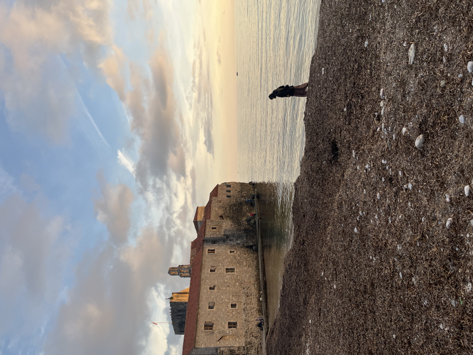 The image depicts a coastal scene at sunset or dusk in Budva, Montenegro, specifically featuring the historic Old Town. In the foreground, a wide beach is densely covered with dark brown, dried marine vegetation and scattered white pebbles. One individual, wearing a dark jacket and a long, light-colored skirt, walks rightward along the waterline, facing the calm, rippling sea. A dark bag is visible on their back. To the left, at the base of the stone structures and near the water, two individuals are seated or standing, and two smaller figures (possibly children) are present closer to the water's edge. The midground and background on the left are dominated by the fortified stone walls and buildings of Budva's Old Town. These structures feature light gray-brown stone, multiple rectangular windows, and reddish-orange tiled roofs. A prominent tower with a red flag flies from its peak is visible, along with another bell-like tower. A small stone quay extends into the water from the base of the city walls. The calm Adriatic Sea stretches across the midground and background, reflecting the sky's colors. A small, dark boat or vessel is visible on the distant horizon to the right. The sky transitions from a light blue at the top to a warm pale orange and yellow near the horizon, with scattered, soft clouds and a faint white contrail. The scene is illuminated by the soft, warm light of the setting sun.