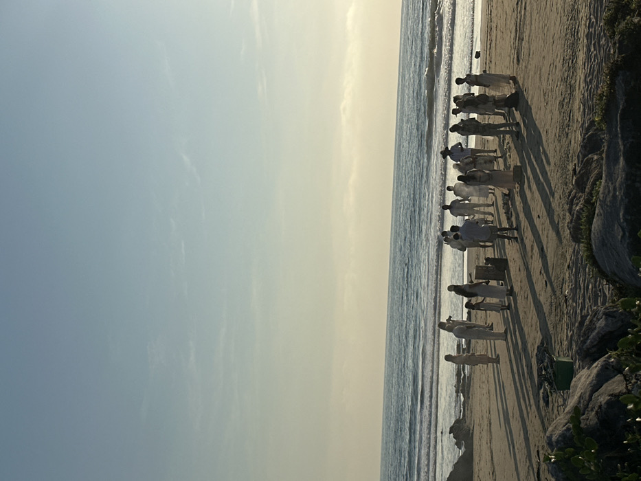 A line of people in white attire stands on a sandy beach, facing the ocean. The tide laps gently at the shore nearby. Their shadows stretch long on the sand, indicating a low sun angle, likely dawn or dusk. Rocks and vegetation line the edge of the beach. A light blue sky fades to a yellowish hue on the horizon.