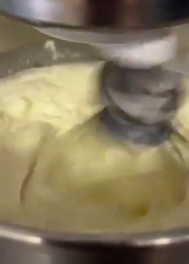 A KitchenAid stand mixer mixes a yellow, creamy substance in its stainless steel bowl