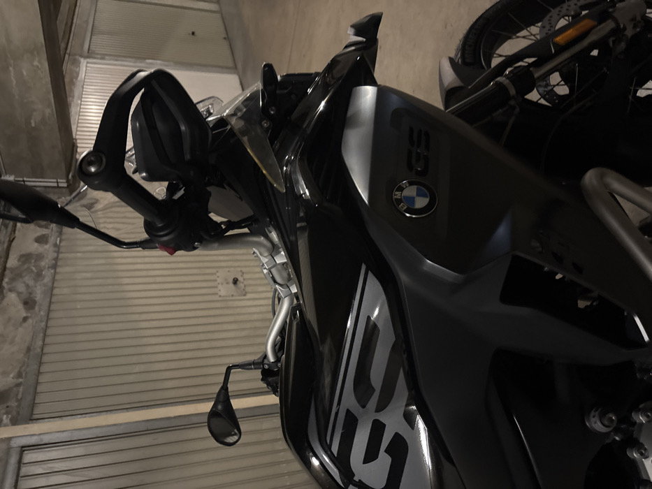 A close-up shot showcases the front portion of a black BMW GS motorcycle