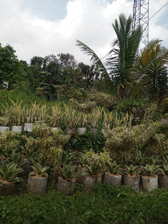 The scene displays an outdoor plant cultivation area situated on a gentle incline in Cibodas, Indonesia, beneath an overcast sky with visible white and gray clouds. The immediate foreground is covered by dark green grass. Directly behind the grass, a row of approximately 10-12 potted Agave plants, characterized by their green leaves with lighter, variegated margins, are contained within gray cylindrical fabric pots. Above this, a layer of smaller, variegated green and yellow foliage plants are interspersed. Further up the slope, a distinct line of taller Sansevieria plants, also exhibiting variegated green and yellow leaves, are individually bundled and placed in white or light-colored cylindrical pots. The midground and background are densely populated with various green trees and shrubs, including several prominent palm trees on the right. A section of a gray metal lattice tower is partially visible on the far right, rising above the tree line. No individuals or specific activities are observable within the frame.