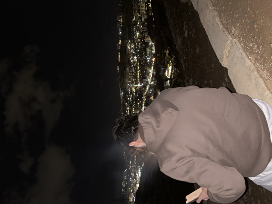 A person stands on the edge of a high cliff overlooking a city at night. The city lights illuminate the landscape. The individual, wearing a brown hooded sweatshirt and white pants, leans forward, peering down into the illuminated cityscape. Clouds are visible in the sky, partially obscuring the dark night. A concrete barrier is to the side of the person, marking the edge of the cliff.