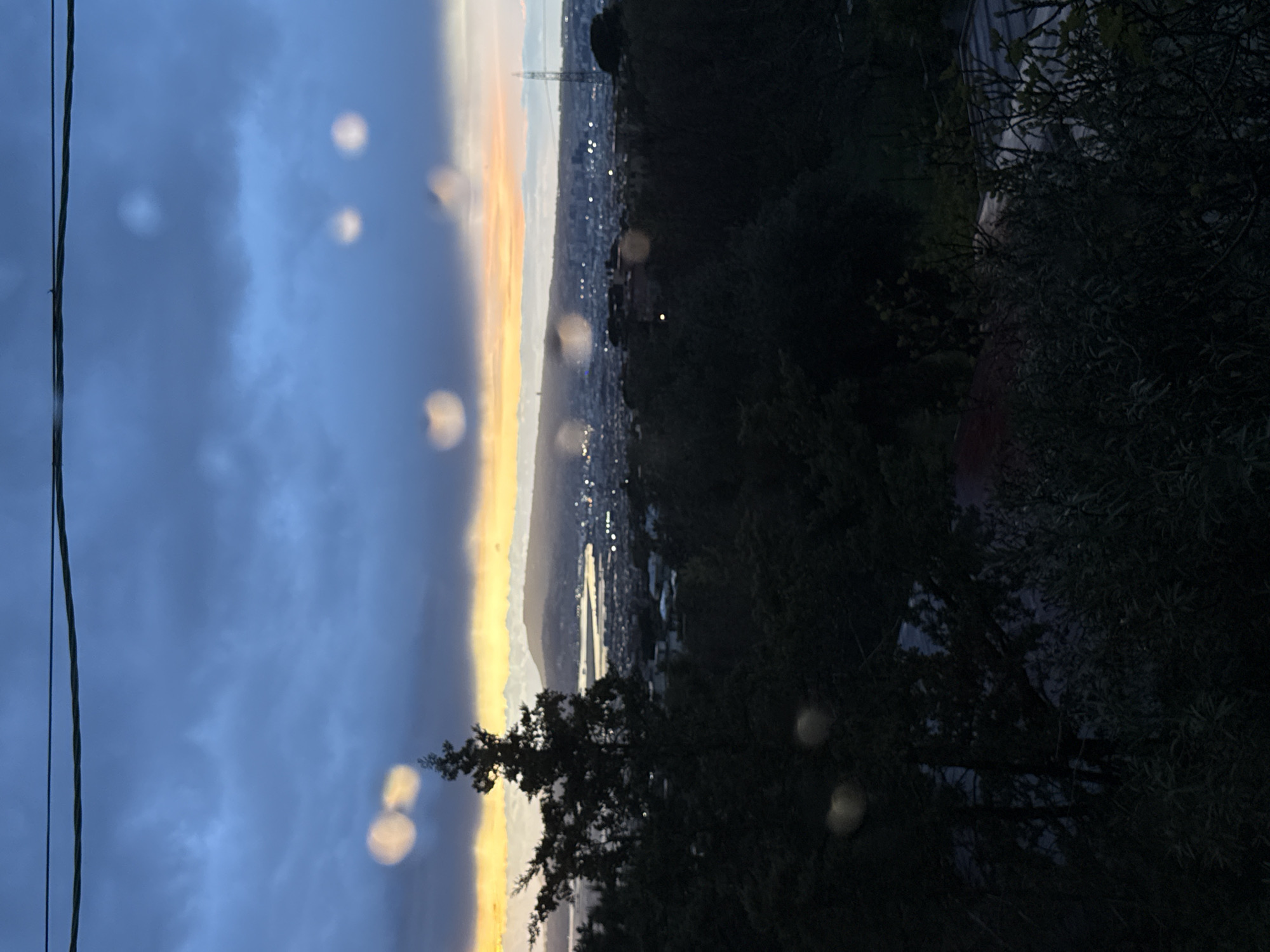 An elevated long shot captures a twilight scene over the city of Ercolano, Italy, looking towards the Bay of Naples. The sky is largely overcast with dark blue-gray clouds dominating the upper two-thirds, featuring a horizontal band of orange and yellow light along the horizon, indicating either sunrise or sunset. Two dark horizontal lines, consistent with power lines, traverse the top of the frame. Numerous circular bokeh effects, likely out-of-focus light sources or lens anomalies, are scattered throughout the image, predominantly in the sky. The foreground consists of dark, silhouetted vegetation, including a tall, slender coniferous tree positioned prominently on the left side. Various dark bushes and smaller trees occupy the lower portion of the frame. Below the vegetation, the midground reveals a sprawling urban area, identified as part of Ercolano and surrounding municipalities, with myriad small, bright lights marking buildings and streets. A body of water, consistent with the Bay of Naples, is visible in the middle distance, reflecting ambient light. In the background, distant landforms or mountains are silhouetted against the horizon's fading light, and a tall, slender transmission tower or antenna is visible on the right side of the distant cityscape. No human figures are present.