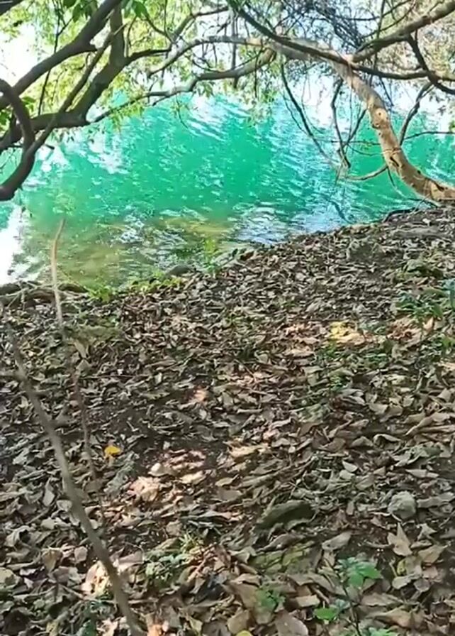 The video presents a tranquil scene of a body of water with strikingly turquoise-colored water, suggesting a natural or artificial pool. The bank is littered with fallen leaves, mostly brown, indicating an autumnal or dry season. The foreground features thin tree branches, adding a depth and framing the view. Some green vegetation is visible amongst the leaves on the ground. The water's surface is slightly rippled. The area is shaded by trees with branches overhead, casting shadows on the ground and water. The overall impression is of a peaceful, natural environment.