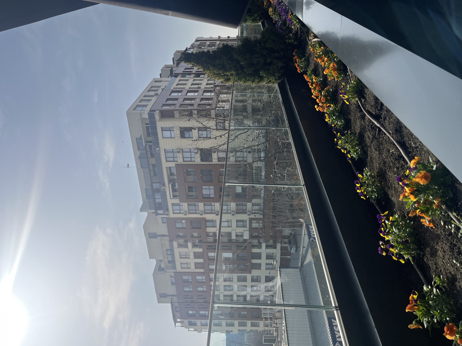 The image displays an elevated urban scene in the city of Plovdiv, Bulgaria, under bright, clear conditions. In the foreground, a dark-colored planter box spans horizontally, populated with rows of blooming viola flowers in shades of orange, yellow, and purple, with green foliage. A black irrigation hose is visible traversing the soil within the planter. A transparent glass railing with slender silver metal posts runs across the mid-left, separating the immediate foreground from the middle ground. To the right of the glass railing, a tall, slender evergreen conifer tree stands vertically. Beyond the railing, a large, multi-story residential or commercial building dominates the midground. This modern structure features a stepped design with multiple facades in varying shades of light beige, brown, and off-white. Numerous windows, balconies, and external air conditioning units are visible on its exterior. At the base of the prominent building, several bare deciduous trees are discernible. Below the glass railing and behind the bare trees, a white cargo container marked "IVSK" is partially visible, along with a parked light-colored sedan. The background consists of a light blue sky with sparse, wispy white clouds. A bright sun in the upper left quadrant causes significant lens flare. No people or active interactions are depicted.