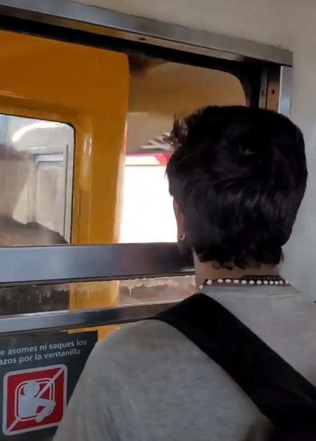 Here's a brief description of the video: The video shows a person from behind, standing inside a train and looking through the window into the next car. The person has dark hair, is wearing a gray t-shirt and a necklace with white beads, and has a black backpack slung over their shoulders. The train car visible through the window is yellow, and the train appears to be moving. A warning sign is visible on the window, discouraging passengers from sticking their arms or heads out.