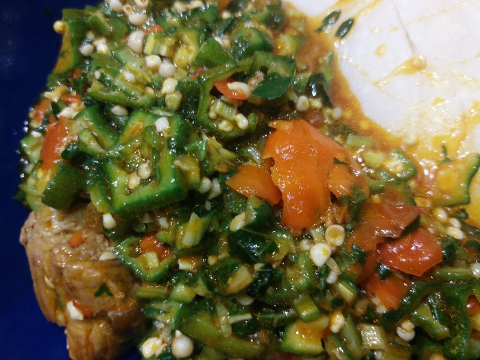 Sliced okra and diced tomatoes in a thick, somewhat glossy sauce coat a piece of meat. A portion of pale, slightly translucent food sits alongside the okra mixture. The dish is presented on a blue plate. The okra slices are a vibrant green with visible seeds. The overall presentation suggests a hearty, flavorful meal.
