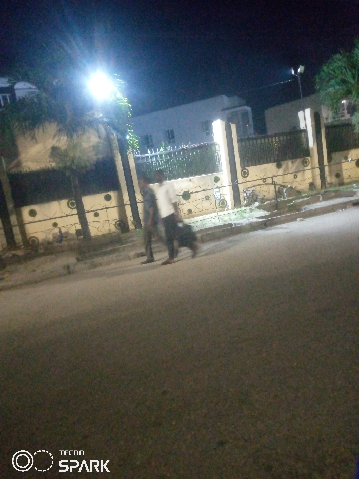 Two individuals walk along a street at night. One is wearing a white shirt, and the other's attire is difficult to discern. They appear to be carrying a dark object between them. A decorative fence surrounds a building with lights and a palm tree. The street is illuminated by a bright streetlight. The image is captured in low light, resulting in some blur and reduced clarity.