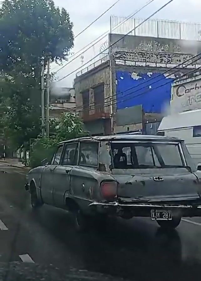 gray, beat-up Ford Falcon Ranchera wagon driving on a wet street in a city. The car is heavily weathered, with visible damage and rust, and has a license plate that reads "XJY 287." The street is lined with buildings, some with peeling paint and visible signs, and a few trees. It's a cloudy day, and the road is wet, indicating recent rain. The camera seems to be inside another vehicle, providing the perspective of someone driving behind the Falcon.
