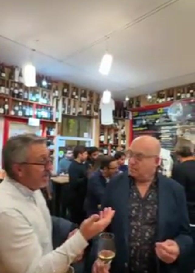 interior of a crowded bar or wine shop. Several people are standing around, some holding wine glasses. The background features shelves packed with wine bottles, reaching nearly to the ceiling. The lighting is bright, with pendant lights hanging from the ceiling. Some of the walls are painted red. There is a bar counter in the middle of the room. The atmosphere appears lively, with people talking and interacting with each other.