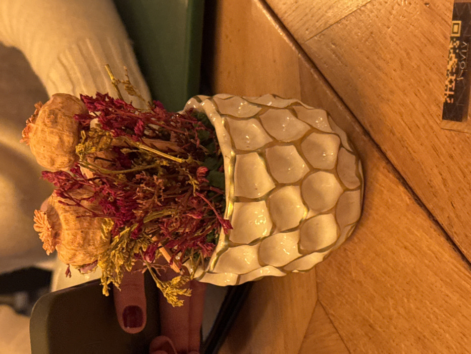 - "A white ceramic pot featuring a gold-outlined honeycomb pattern holds a dried floral arrangement" by FM-BZgWn2, licensed under CC BY 4.0