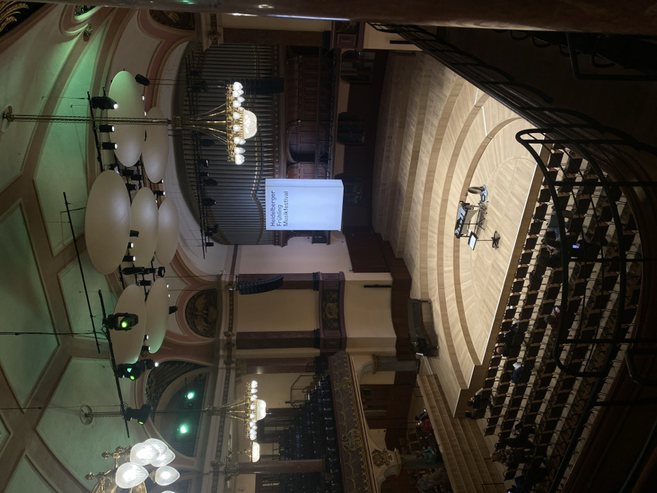 This image depicts the grand concert hall of the Stadthalle Heidelberg, Germany, viewed from an elevated position, likely an upper balcony. The scene showcases an ornate interior with a high, arched ceiling painted in pale green and cream, featuring decorative molding. Several elaborate brass chandeliers with multiple glass globes illuminate the space, complemented by modern stage lighting fixtures, some emitting green light, and large, oval acoustic reflectors suspended from the ceiling. A large pipe organ dominates the rear wall of the stage area, below which a rectangular, illuminated white banner hangs, displaying "Heidelberger Frühling Musikfestival" in black text. The stage itself is semi-circular and tiered, constructed from light-colored wood. On the front section of the stage, a vibraphone or marimba, a music stand, and other percussion instruments are set up. Further back on an elevated tier of the stage, a black grand piano is positioned. The audience seating consists of numerous rows of dark-colored chairs arranged on the main floor and in multiple tiered balconies with decorative railings. Scattered individuals are seated throughout the audience sections, appearing to be patrons observing or waiting for an event. Large dark speakers are mounted on the walls flanking the stage. Reddish-brown architectural pillars with ornate capitals are also visible within the hall.