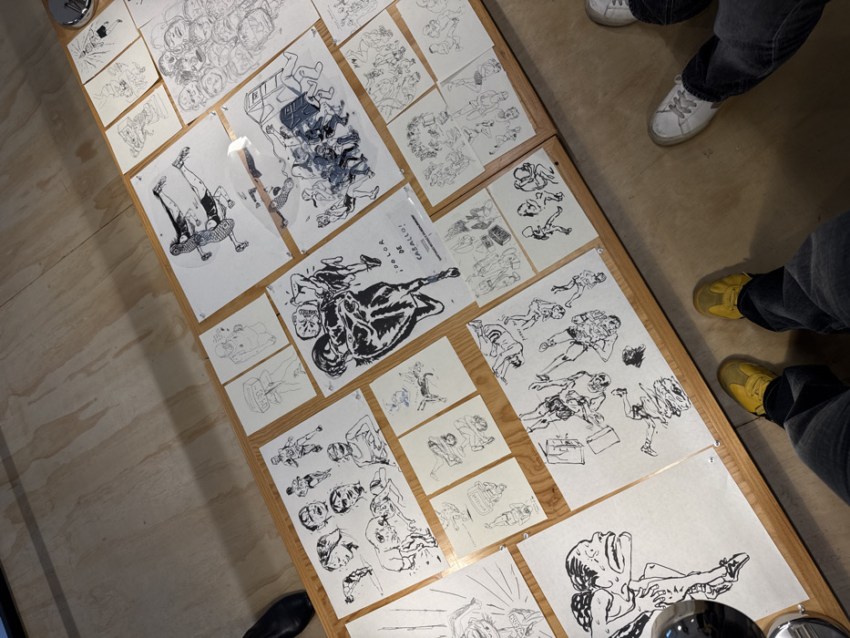 A wooden table displays numerous black and white cartoon drawings pinned to its surface. Figures in various poses dominate the sketches. Two people stand near the table. One wears white sneakers and jeans, while the other has on jeans and yellow sneakers. A black shoe is visible at the bottom corner. Metal objects are at both the top left and bottom right corners of the image.