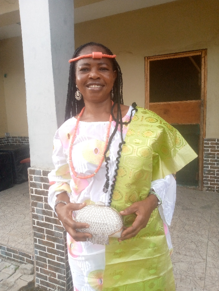 A smiling adult female with braided hair stands facing the camera in front of a building in Iranla, Nigeria