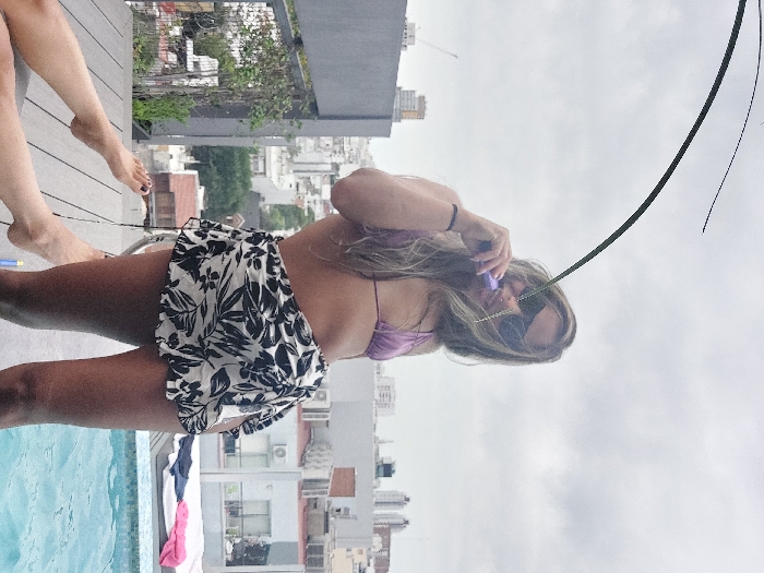 A woman in a bikini top and a patterned skirt stands beside a pool, holding what appears to be a small electronic device to her ear. She is wearing sunglasses. In the background, there is a cityscape with various buildings under an overcast sky. A glimpse of another person's legs can be seen at the edge of the image. The photo is taken at an angle, with the sky occupying the top portion of the frame.