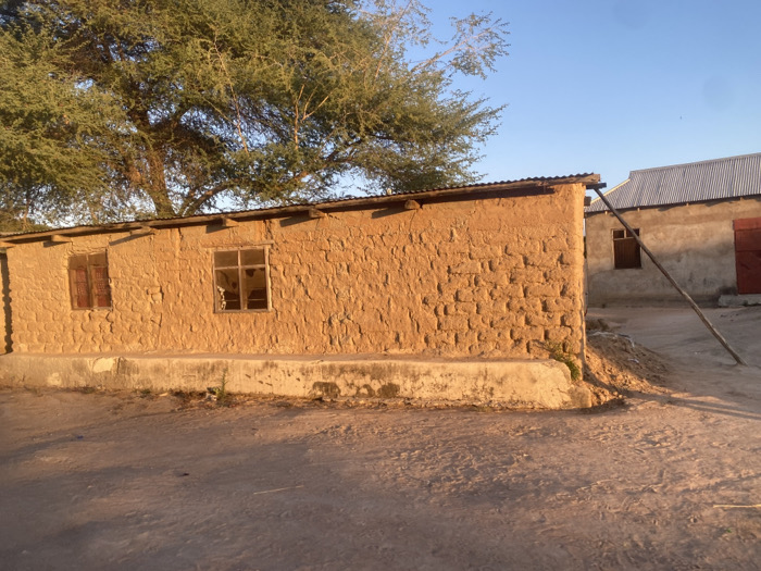 mud brick building with two windows on the side, located in Dodoma, Tanzania, at the coordinates -6