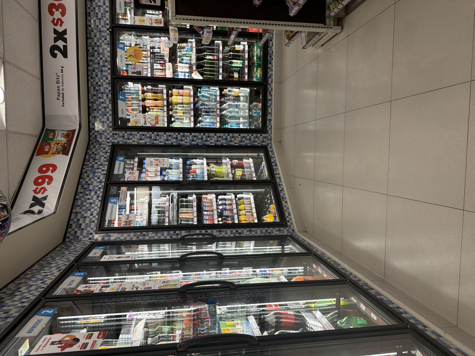 grocery store aisle with multiple refrigerated cases. The cases contain various beverages and food items such as juice, beer, and snacks. Signage indicates promotions like "2x$3" and "2x$99" for select items, including "Papas Bitz." The aisle is brightly lit and has a tiled floor and blue-tiled walls around the refrigerators. The refrigerators are labeled with numbers indicating the section of the store.