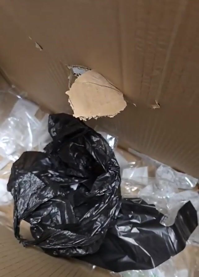 A hand reaches into a cardboard box and lifts a bottle covered in black plastic out of the box. The box is lined with clear plastic wrapping. There is a tear in the side of the box.