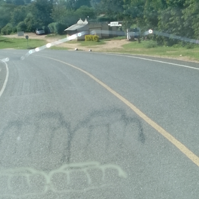 This image depicts a paved asphalt road within Kola ward, Kenya, observed through a surface exhibiting circular and elongated light flares