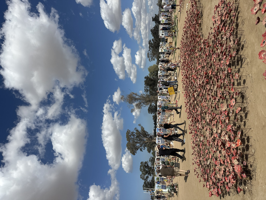 The image depicts an outdoor memorial site located in the Eshkol Regional Council, Israel, under a bright blue sky with numerous white cumulus clouds. The ground is dry, light brown earth. In the foreground, a dense field of artificial, reddish-orange poppy-like flowers, each on a dark stem, is planted directly into the ground, extending from the lower right corner towards the mid-left. A dirt path separates this flower field from rows of numerous individual memorial displays in the midground and background. Each display consists of a vertical stand featuring a photograph of a person, often accompanied by additional commemorative items such as real and artificial flowers, small flags, and other personal objects at its base. Several individuals are walking along the dirt path and among the memorial displays, observing them. A yellow sign on a pole is visible among the displays in the mid-right. Eucalyptus trees are scattered in the distant background.