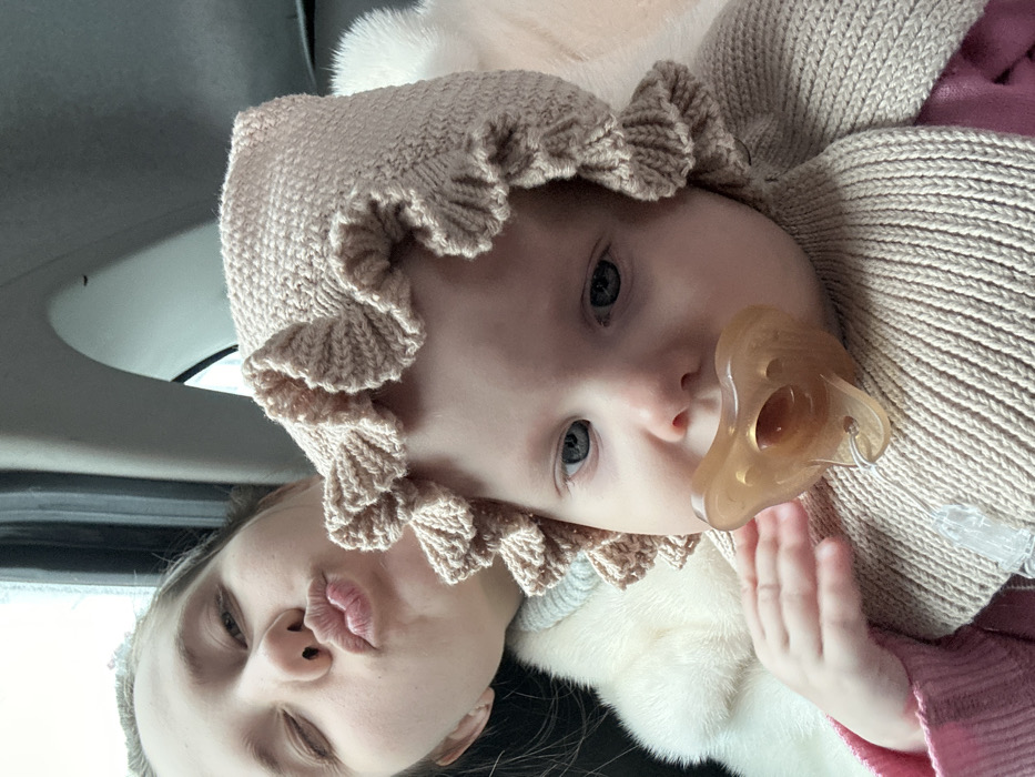 An adult female and an infant are depicted within a vehicle interior. The adult female, positioned in the upper left, has dark hair and wears a light-colored fur-trimmed coat over a ribbed gray top. She winks and puckers her lips towards the camera. The infant, prominent in the foreground, exhibits light skin and blue eyes, dressed in a light beige knitted bonnet with ruffled edges and a matching ribbed knitted garment. A brown pacifier is present in the infant's mouth, with a small hand visible nearby. The infant looks directly at the viewer. The background consists of an indistinct vehicle interior. No specific landmarks or environmental features are present to identify a precise location within Pokrov, Russia.