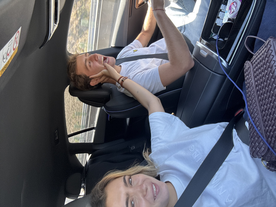 The image captures two young individuals inside a vehicle, appearing to be in motion on a highway or rural road