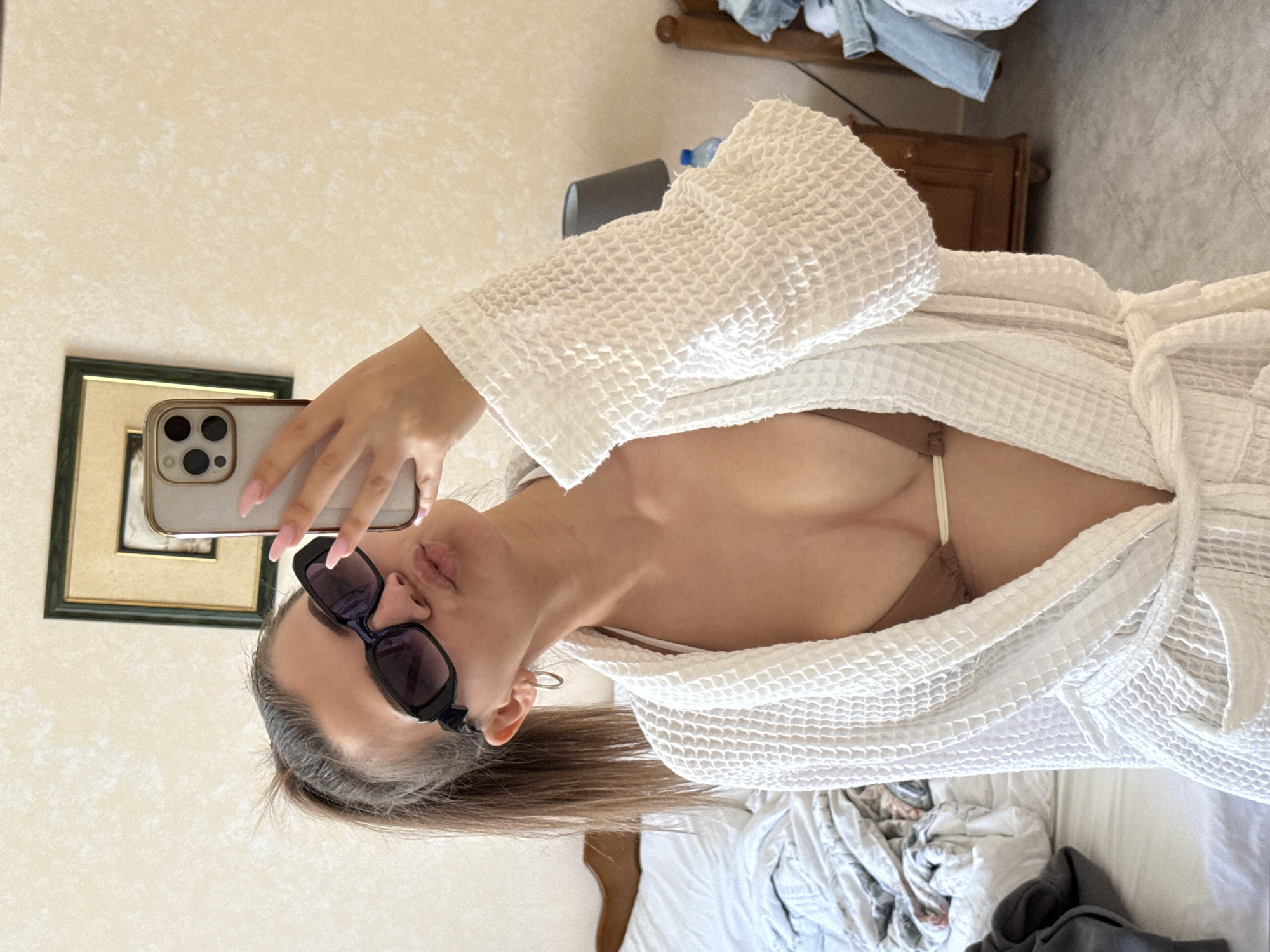 A woman wearing sunglasses and a white robe holds a smartphone to take a selfie. A brown bra is visible under the robe. The background includes a framed picture, furniture, and bedding. The location is not specified in the prompt.