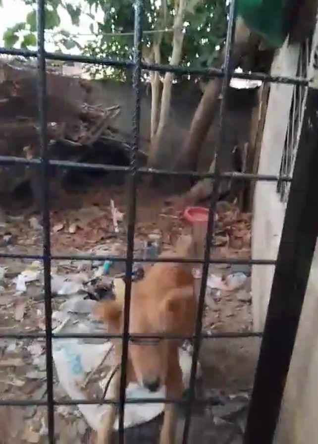 A brown dog is visible behind a black metal fence. The dog is standing on a white surface, possibly a bag or piece of material. The background contains a mix of ground, trash, and foliage. The dog is facing the camera and barking aggressively.