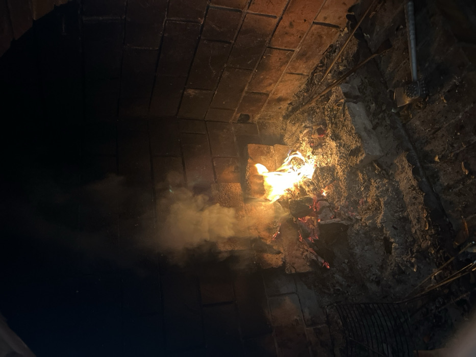 This image depicts a scene within a brick fireplace, located in Lampertheim, France