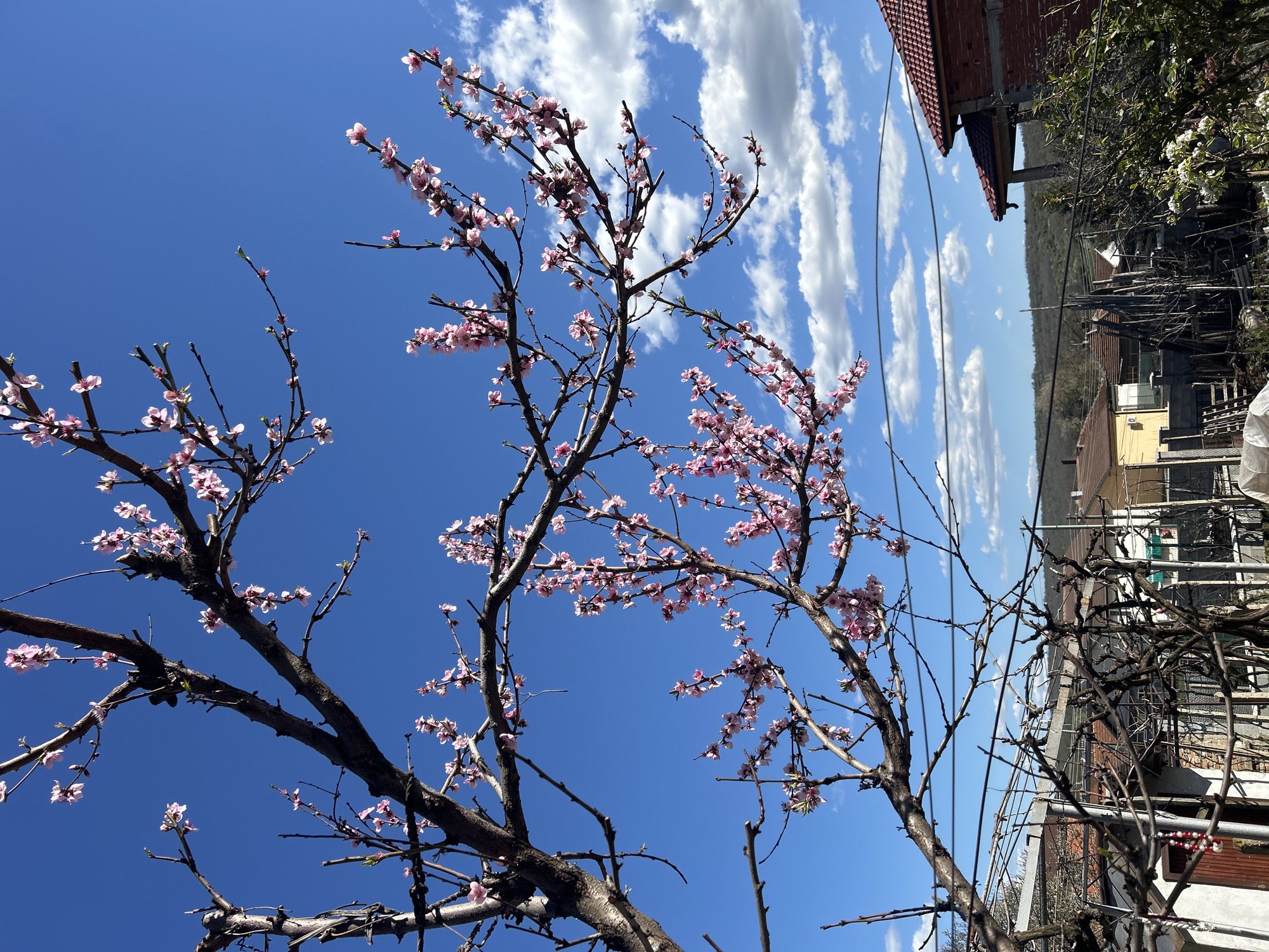 flowering tree against a bright blue sky with scattered white clouds. The tree's branches are mostly bare, but adorned with numerous small, light pink blossoms. In the background, out of focus, is a cityscape with buildings featuring red tile roofs and other structures. This scene is likely located in Bukovlak, Bulgaria. The image is taken from a low angle, looking upwards into the tree and sky.