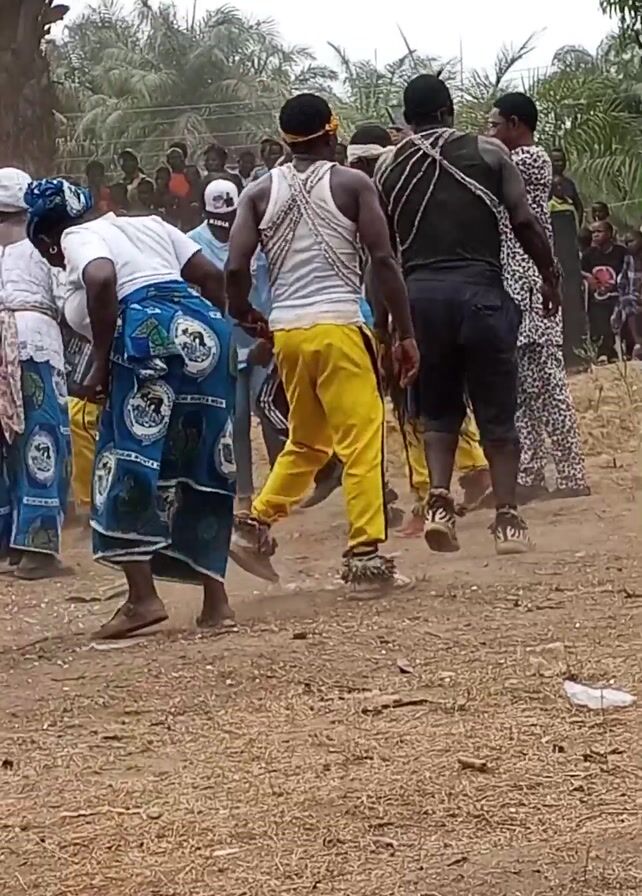 group of people participating in a dance in an outdoor setting. Several people are wearing yellow pants and white tank tops, with what appear to be spiky adornments around their ankles. Some women are wearing matching blue and white patterned skirts with white tops. The dance takes place in a dusty, grassy area, with an audience visible in the background. The overall atmosphere seems celebratory.