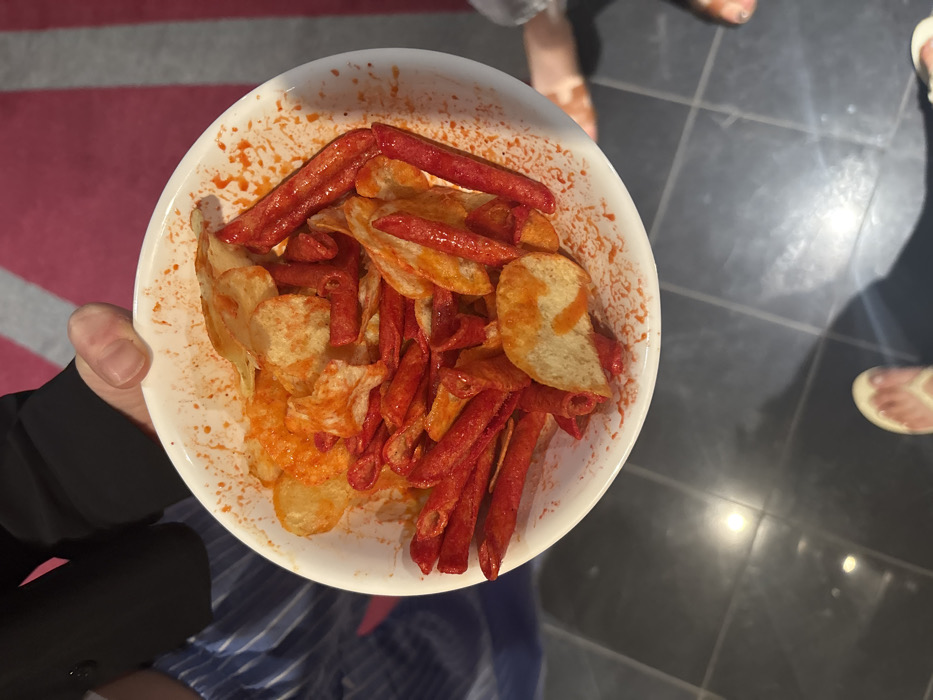 A white bowl overflows with potato chips and Takis. The chips are thinly sliced and light in color. Bright red Takis fill the bowl, mixed among the chips. The bowl’s interior and exterior are speckled with red seasoning. A hand in a black jacket holds the bowl. In the background, there are feet in flip-flops and various floor surfaces: red and white striped, and black tile with a light reflection.