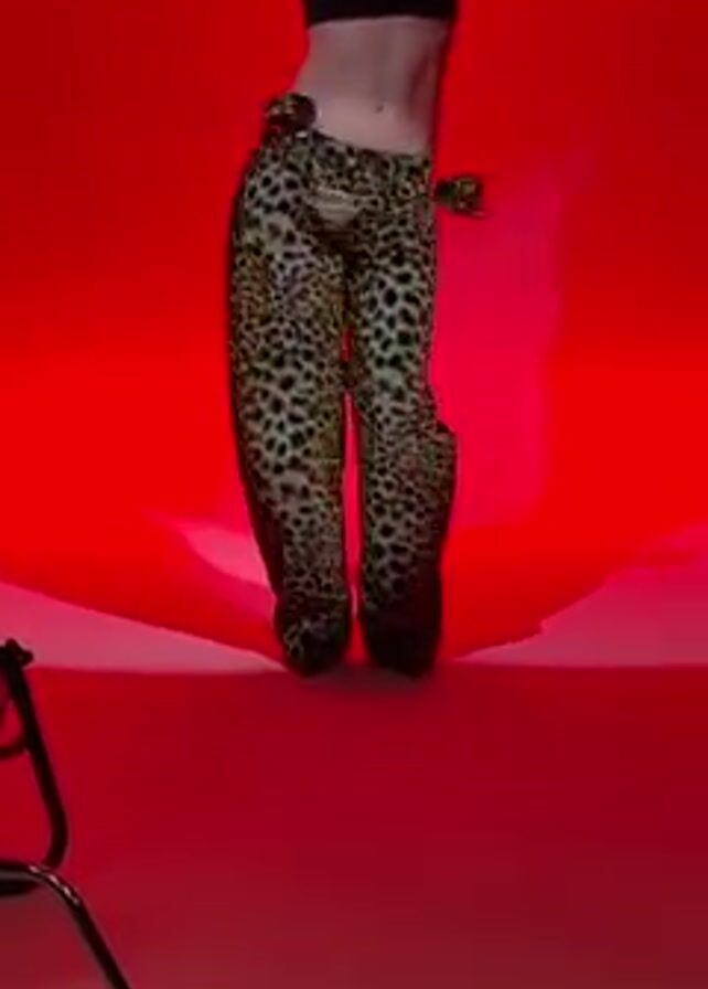 A woman wearing a black bandeau top and leopard-print pants is dancing against a red backdrop in a studio setting