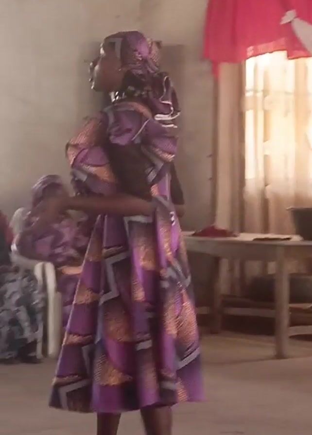 A young woman stands in what appears to be a church, giving a speech. She wears a purple and gold patterned dress with a matching head covering. She is holding a microphone. Behind her, there are people seated in chairs, listening to her. In the background, there is a speaker, a table, and a window draped with pink and white fabric. The room is simple, with concrete floors and walls. The Infinix Note 30 Pro watermark is visible in the bottom left corner.