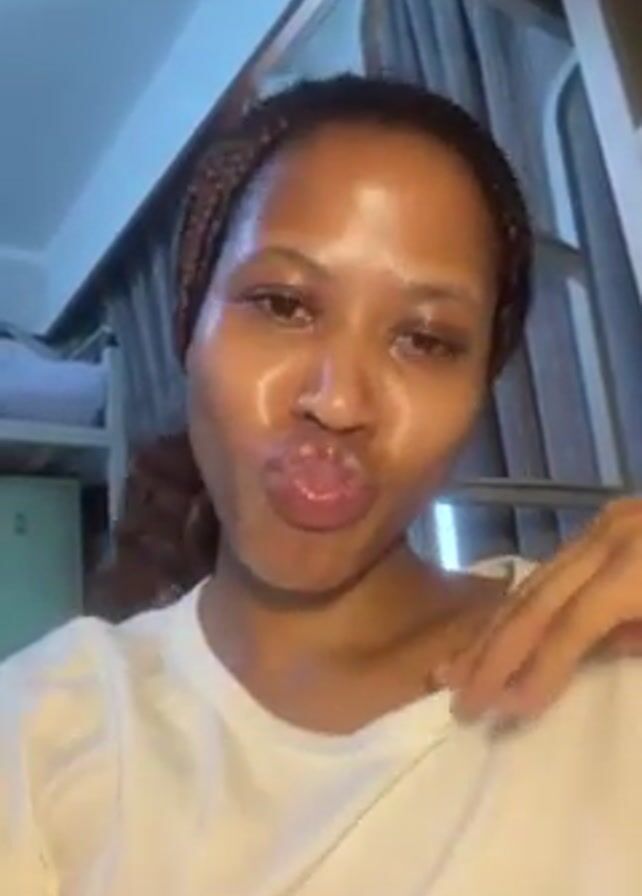 A woman with braided hair, wearing a white t-shirt, is the primary subject of the video. Her skin has a shiny appearance, suggesting moisture or oil. She initially holds her hand up to the camera with her palm facing forward. She then makes a surprised facial expression by widening her eyes and slightly opening her mouth, before lowering her hand and resting it on her shoulder. She finishes with a smile and flashes a peace sign. A bunk bed and some curtains are visible in the background. The video appears to be taken in a simple, possibly shared living space.