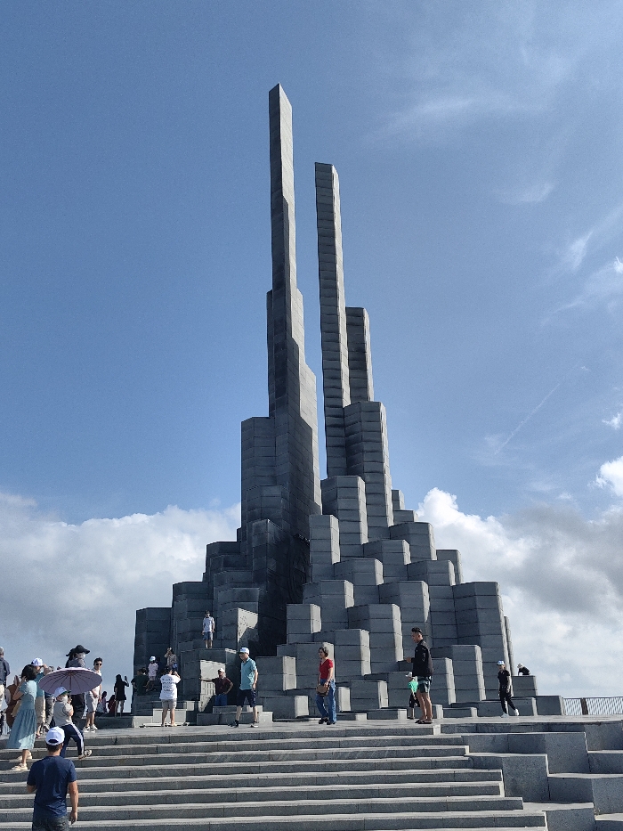A towering gray monument constructed of stacked rectangular blocks rises against a bright blue sky with scattered clouds. The monument features two tall, slender columns extending upwards. People are scattered on the steps and platform surrounding the base. The overall scene suggests a public gathering or tourist attraction at a monumental site.