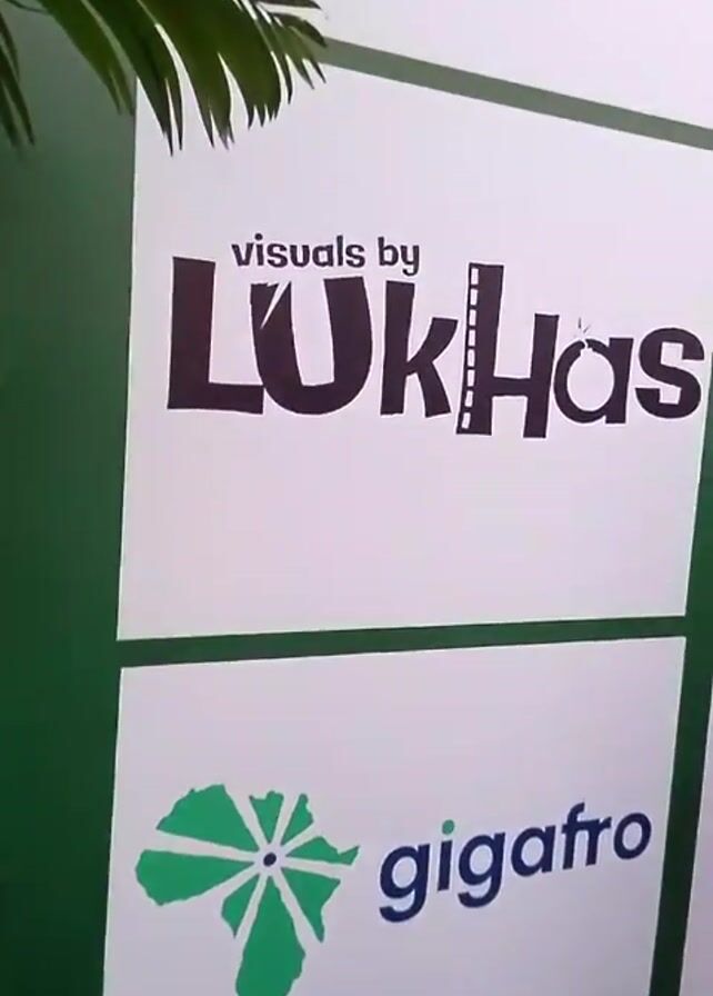 media wall with logos of different organizations and brands. The logos include "visuals by LUKHas," "gigafro," "STV," "Lagos Junction," "NTA," and "Events by Back in Black." People are walking past the media wall, including one person in a white shirt and a red and white head covering, and another person in a green shirt. The environment appears to be an event venue or a promotional space.
