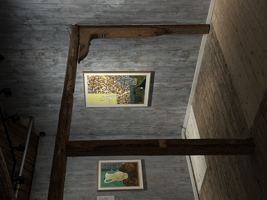 The image displays an interior art exhibition space located in Ramberg, Norway