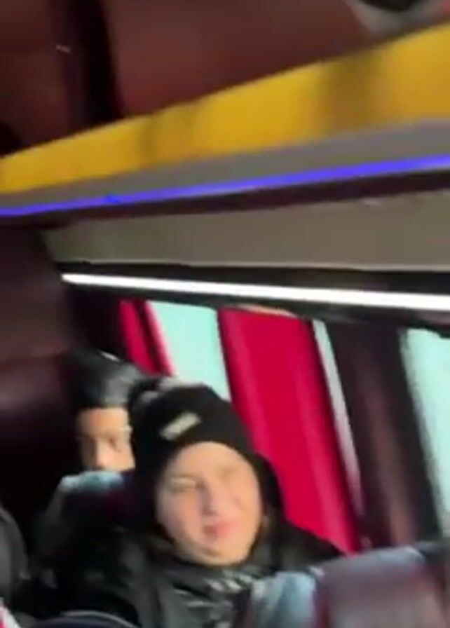 The video captures a lively scene inside a bus, filled with people who appear to be enjoying themselves. The shot opens with a woman in a hijab smiling and waving at the camera, sticking her tongue out playfully. The camera then pans around the bus, showing more passengers, including some wearing winter hats and others in casual clothing. The interior of the bus features dark red seats and a ceiling with yellow and blue lighting strips. Some passengers are singing, clapping, and dancing along to music playing in the background.