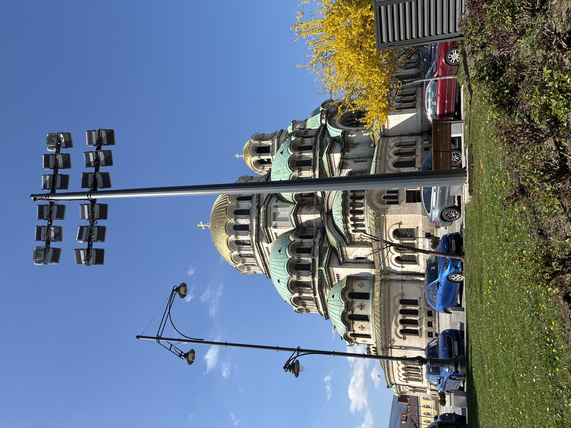 Alexander Nevsky Cathedral in Sofia, Bulgaria, on a sunny day. The cathedral, with its gold domes and green roof, dominates the scene. Several cars are parked along the side of the cathedral. Streetlights stand in the foreground, with the blue sky visible behind them. A patch of green grass is visible to the side of the cars. Yellow flowers bloom from a tree near the cathedral.