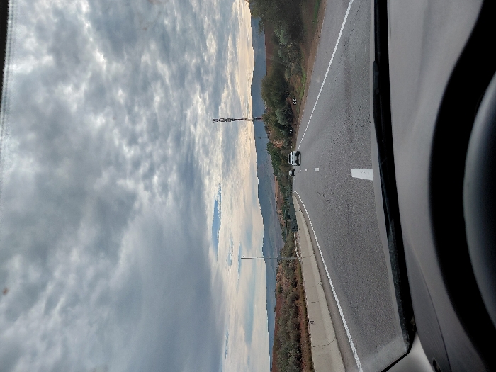 A highway view is captured from within a car, likely the driver's perspective