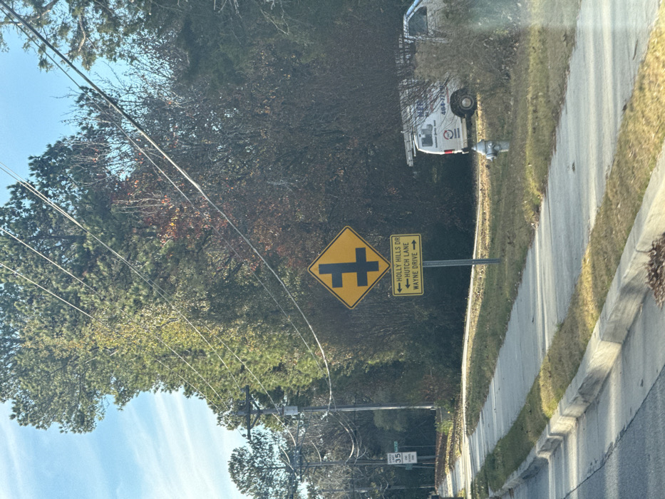 A street view shows a yellow road sign with a black cross shape indicating an intersection. A sign below it points left for Holly Hills Drive and Hutch Lane, and right for Wayne Drive. An utility van with writing is parked on the green side of the road. Powerlines intersect the trees and sky. A sidewalk and curb runs alongside the road. A speed limit sign of 35 is visible.