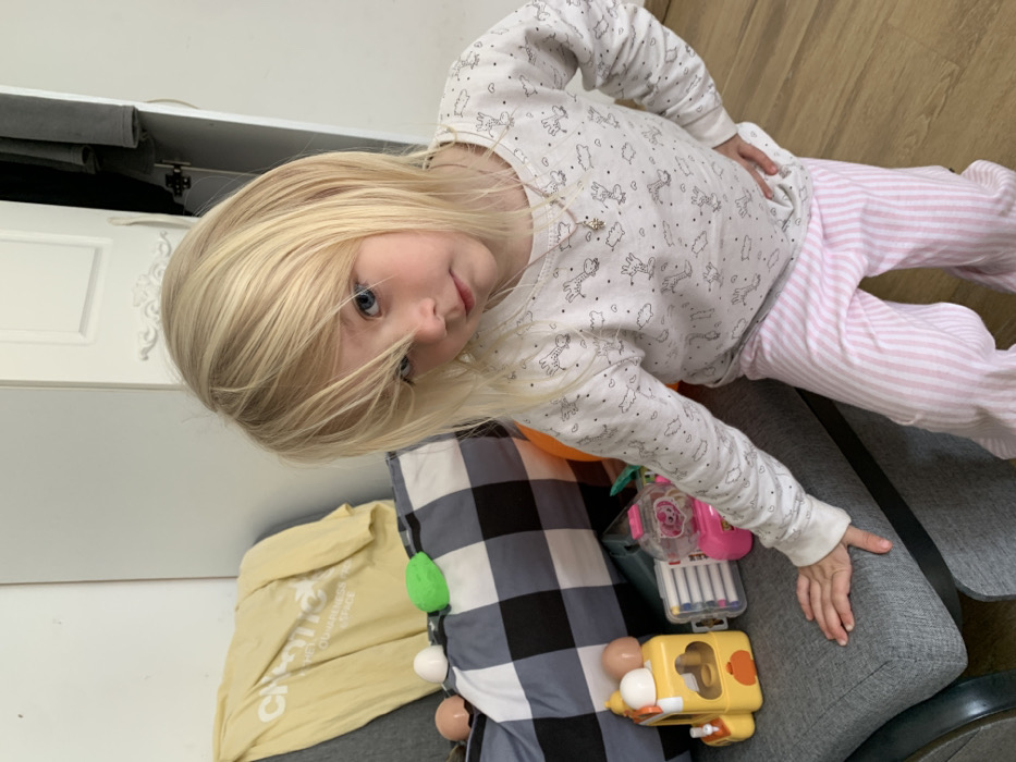 A young child with blonde hair is tilted to the side and looking at the camera. The child is wearing a white long-sleeved pajama top with giraffe patterns and pink striped pajama bottoms. Next to the child is a gray cushion with a black and white checkered pattern, and two toys rest on the cushion: a pink plastic toy case and a yellow toy. A yellow t-shirt is beside the cushion.