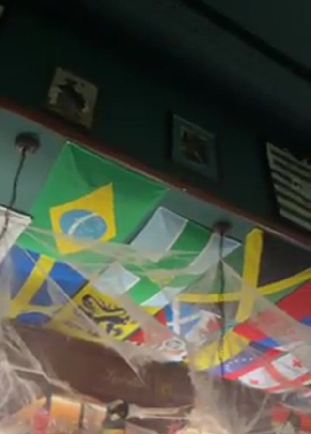 bar decorated with national flags of various countries and Halloween-themed decorations
