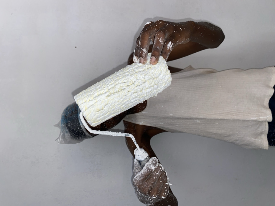 The image depicts an individual engaged in painting within an interior space in Gwong, Nigeria. The person, with dark skin, wears a light-beige ribbed tank top, which is splattered with white paint. Their head is covered by a blue material, encased in a clear plastic bag. Both hands are heavily coated and dusted with white paint as they firmly grasp a paint roller and its handle. The paint roller is cylindrical, densely covered with thick, textured white paint, suggesting it is actively in use or has just been used. The background consists of a plain, uniformly light-colored wall, possibly white or light grey, indicating a recently painted or prepared surface.