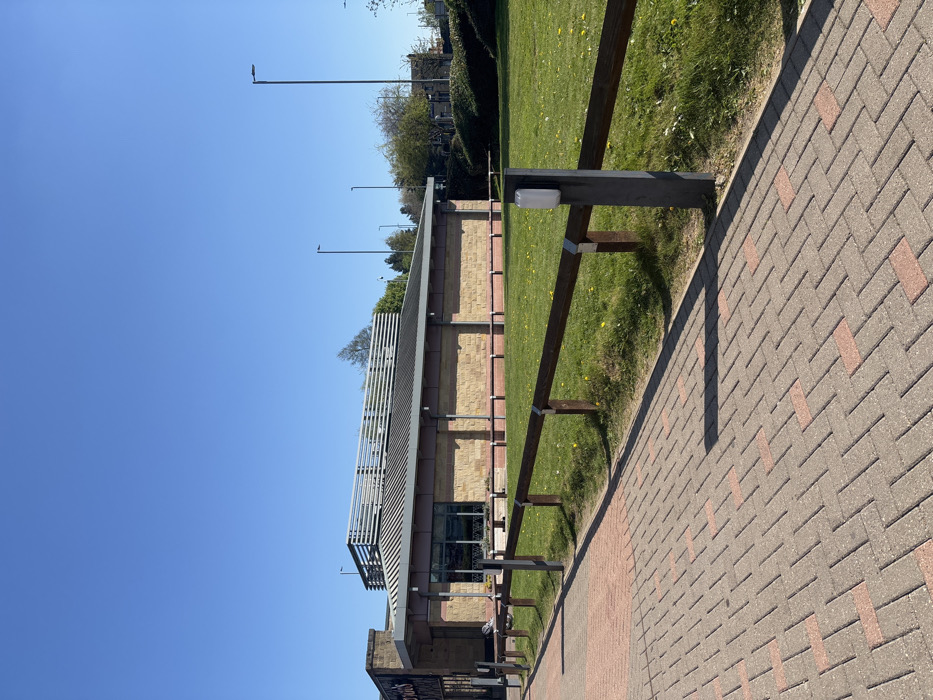 paved walkway leading to a wooden fence and a grassy area. The walkway is made of interlocking grey bricks with reddish-brown accents. The fence is made of wooden posts and rails. Behind the fence is a grassy area with some small yellow flowers. The sky is a clear blue. On the left side of the image, a single-story brick building with a flat roof and a metal grate is visible. There are no people present. The image appears to have been taken on a sunny day. The location is Bradford, United Kingdom, specifically the area around the coordinates latitude: 53.791, longitude: -1.748. The building might be a retail outlet or restaurant.