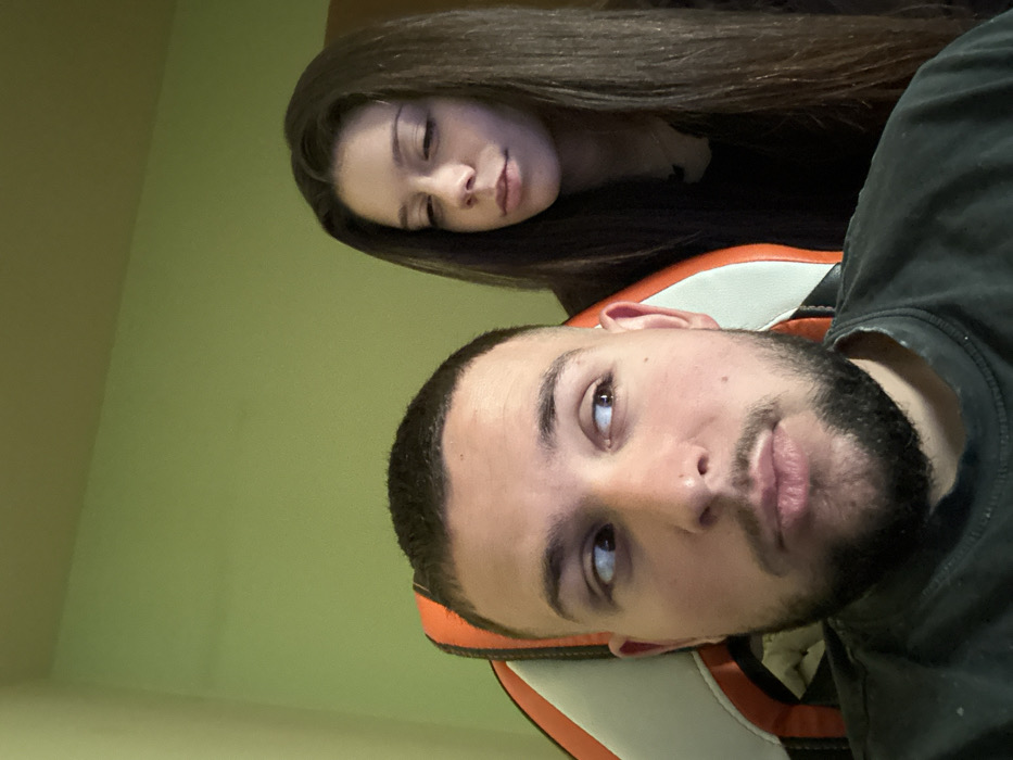 The image displays two individuals within an indoor environment. In the foreground, a male subject with a short fade haircut and a dark beard is seated in a gaming chair featuring orange and white accents. He wears a dark, possibly charcoal, crew-neck t-shirt. His head is turned, and his eyes are directed towards his right (viewer's left), with his lips slightly pursed. Behind and to the right of the male, a female subject with long, dark, straight hair is partially visible. She appears to be wearing a dark garment and her eyes are partially closed, her gaze also directed towards the viewer's left. The background is a plain, light green painted wall. No discernible features within the image indicate a specific location in Sofia, Bulgaria.
