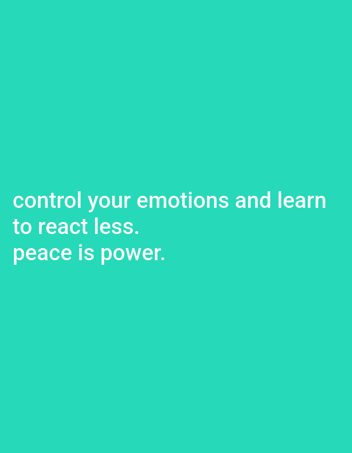 The image consists of a uniform teal-colored background. White sans-serif text is centrally aligned in the lower-left quadrant of the frame, displaying the message: "control your emotions and learn to react less. peace is power." There are no discernible people, subjects, objects, actions, or interactions depicted. The visual content of the image does not provide any identifying information regarding a physical location, including the city of Khiva, Uzbekistan.